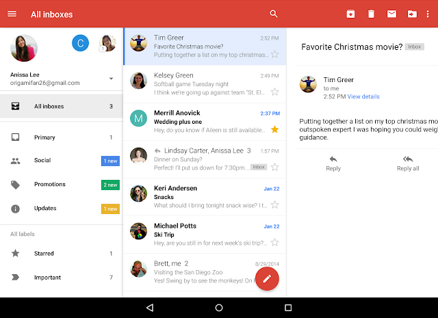 วันนี้ Gmail for Android อัพเดตเพิ่มหน้า All Inboxes หรือกล่องเมลขาเข้าแบบรวมศูนย์ กล่องเดียวรับเมลเข้าได้จากทุกบัญชี ช่วยให้คนที่มีอีเมลหลายบัญชีสามารถติดตามเมลได้สะดว กขึ้นมาก นอกจากนี้ อีเมลอื่นนอกจาก Gmail ยังแสดงผลแบบ conversation view จัดกลุ่มเมลเหมือนกับ Gmail แล้วเช่นกัน