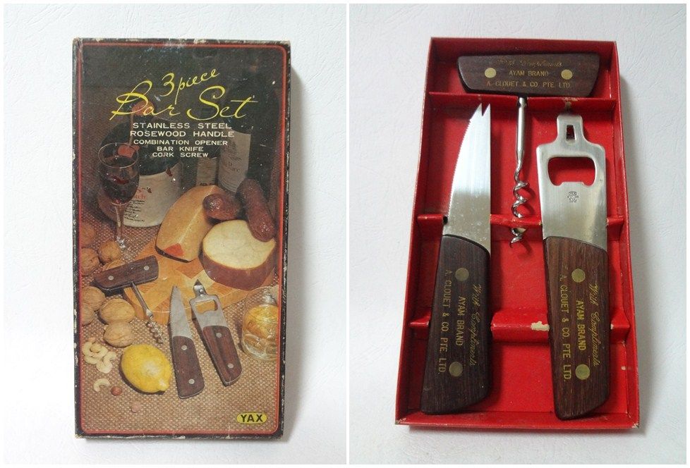 1398. 3 Piece Bar Set ชุดที่เปิดขวด เปิดกระป๋องและมีด ชุดนี้มี3ชิ้น ทำจาก Stainless Steel ด้ามจับเป็นไม้ สภาพดี งานเก่าโดย YAX Japan 480บาทรวมส่งครับ