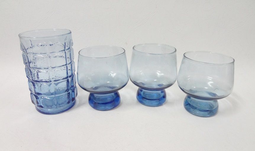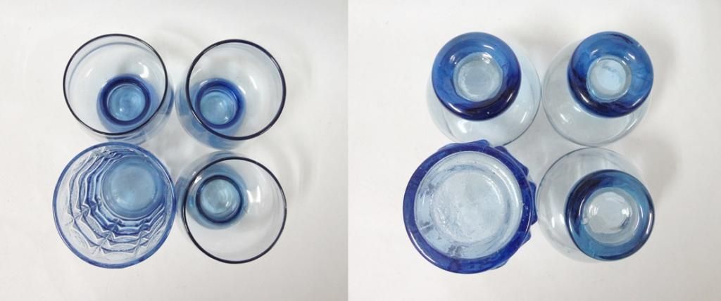 1420. แก้วสีน้ำเงิน 4 ใบ 2แบบ ไม่ระบุที่มา สูง 8 และ 11 cm ใบเล็ก1ใบ มีฟองอากาศในเนื้อแก้วนิดนึงครับ ทั้งหมด 200บาทรวมส่ง