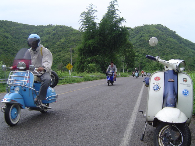 จอดกันให้เป็นระเบียบ เตรียมตัวขึ้นรถปิกอัพเพื่อขึ้นเขาไปบริจาคของและทำบ ุญ เพราะต.ช.ด. ที่นั้นเค้าบอกว่ารถVespa ขึ้นไปไม่ไหว