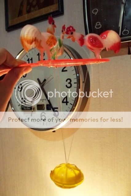ไก่จิกพลาสติกแข็ง เชยได้ใจ ของเล่นเก่าแบบลงในหนังสือ "ของเล่นกับความทรงจำ" ของเอนก นาวิกมูล เพียงเคลื่อนไหวลูกตุ้ม ไก่สามตัวจะผลัดกันก้มๆเงยๆจิกข้าวเปลือกกันอย่างเมา มันส์ 350ส่ง30