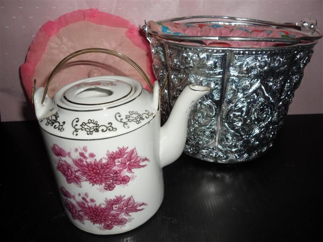24. ถังพร้อมกาน้ำชาดอกแดง สภาพสวย ฝากาตรงช่องจับบิ่นเล็กน้อย ขายชุดนี้ 680 บาท