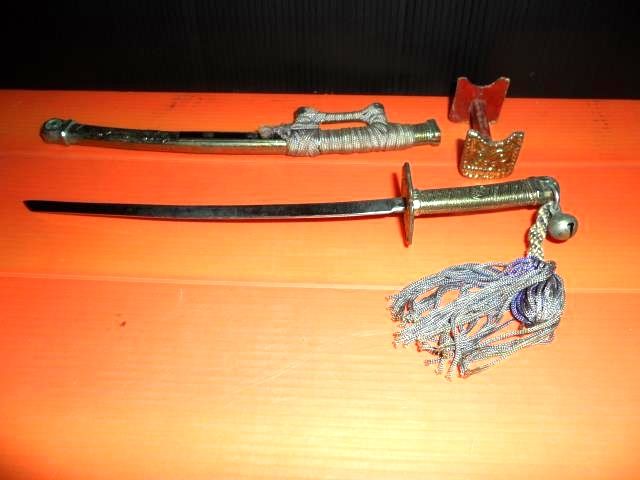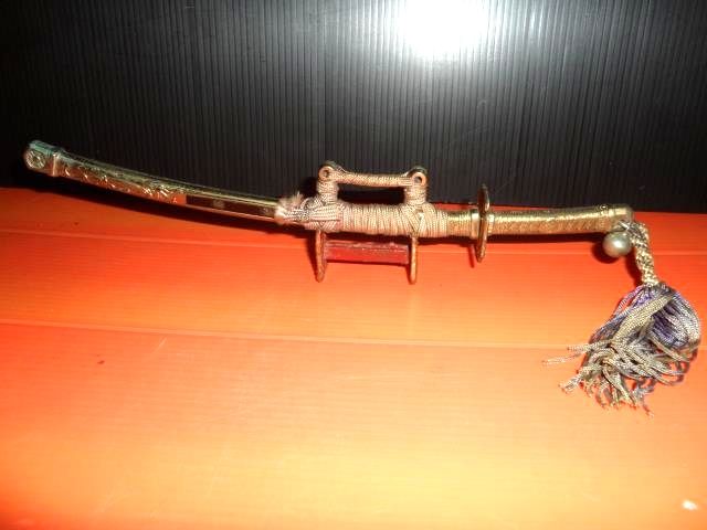 246. ดาบซามูไรเก่า ...ไว้เปิดซองจดหมาย ฝักเป็นทองเหลือง ตัวดาบไม่แน่ใจว่าทำจากอะไร น่าจะเป็นสแตนเลส ยาว 9 นิ้ว ตั้งประดับโต๊ะทำงานก็ดี ดูน่าเกรงขาม ขายแล้วค่ะ