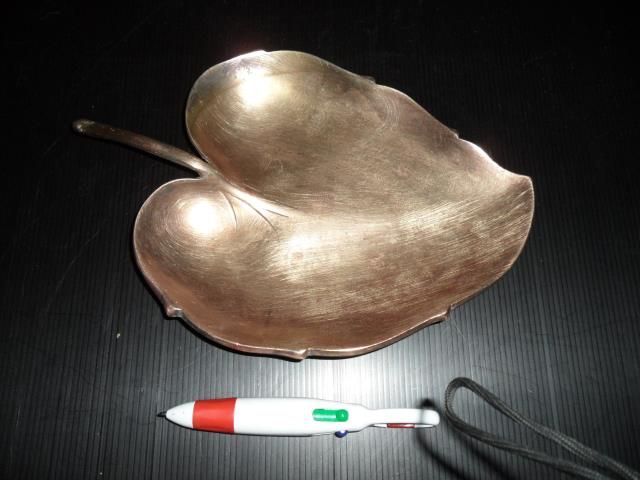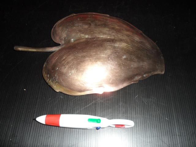 245. ถาดทองเหลืองรูปใบไม้ งานนอก ยาวจากก้าน 10 นิ้ว กว้างสุด 7 นิ้ว เนื้อหนาหนัก ราคา 650 บาท