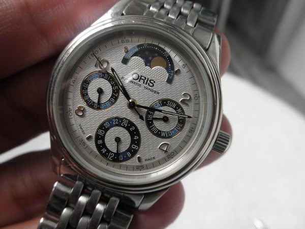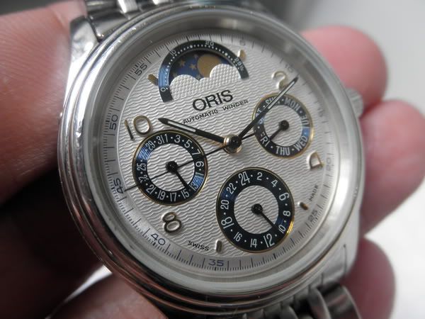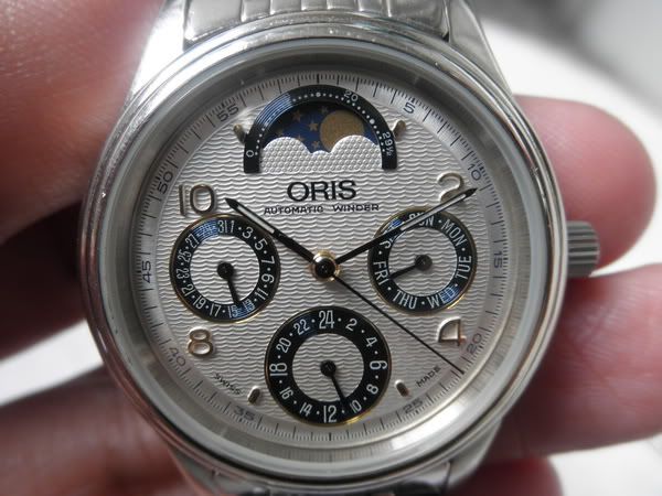 Oris automatic winder moonphase 4 หน้าต่าง ตรง 12 นาฬิกาพระจันทร์สวยบอกข้างขึ้นข้างแรม ตรง 3 นาฬิกาบอกวันของสัปดาห์ ตรง 6 นาฬิกาบอกเวลา 24 ชม.(สามารถตั้งบอกเวลาประเทศที่สองได้) ตรง 9 นาฬิกาบอกวันที่ หน้าปัดขนาด 34 มม.แกะลายกิโยเช่สวยงาม การจัดวางเลเอาท์บริเวณหน้าปัดสำหรับนาฬิกาเรือนนี้จ ัดได้ลงตัวสวยงามมาก ตัวเรือนพร้อมสาย Stainless steel ยาว 6.7 นิ้ว ทำงานครบทุกฟังชั่น เดินดี เดินตรง สภาพพร้อมสวมใส่แบบนี้หายาก รับประกันครับ