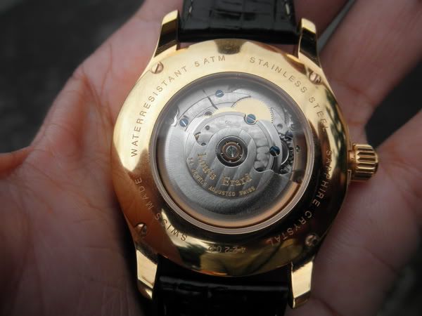 Louis Erard Auto 34 jiawes สองเข็มครึ่ง วันที่ Big Date 2 ช่อง หน้าปัดขนาด 40 มม.ไม่รวมเม็ดมะยม ตัวเรือน Stanless Steel เคลือบ PVD (Physical Vapor Deposition) สีทองทั้งตัว กระจกหน้าหลังเซัฟฟาย ด้านหลังเปลือยโชว์การทำงานของกลไก เครื่องขัดลายก้นหอยดูสวยงาม เรือนนี้ไม่มี กล่อง และใบนะครับ รุ่นนี้ตัวแทนจำหน่ายในเมืองไทยขาย 58,000.-บาท ส่ง EMS ฟรี รับประกันครับ สำหรับเรือนนี้พิเศษสวยกริ๊ปจริง ๆ