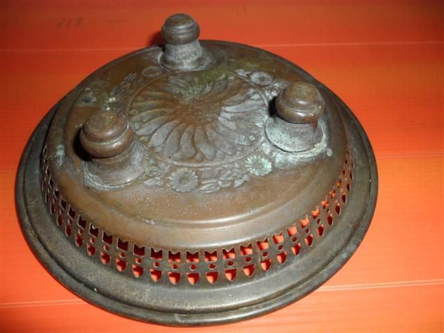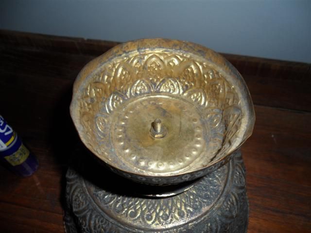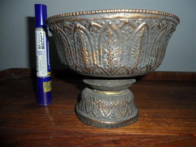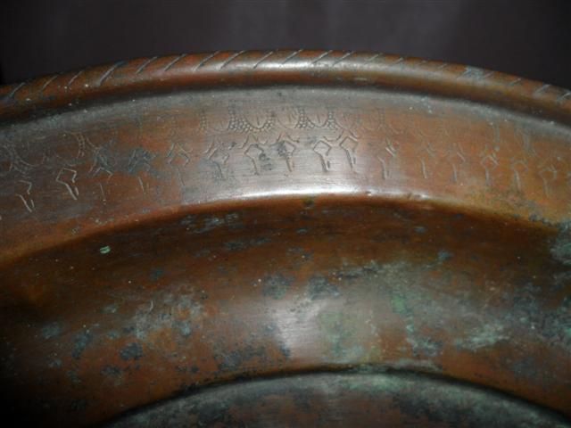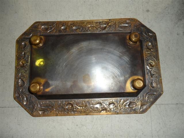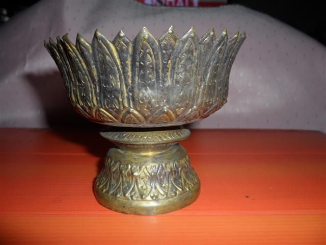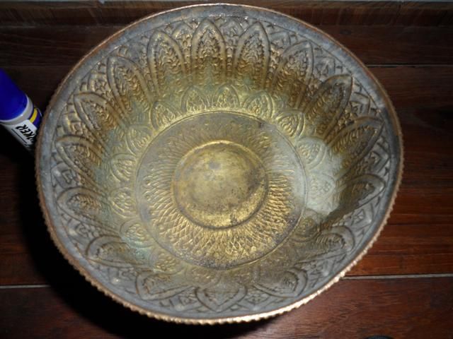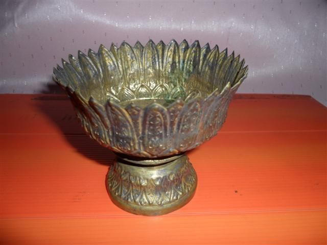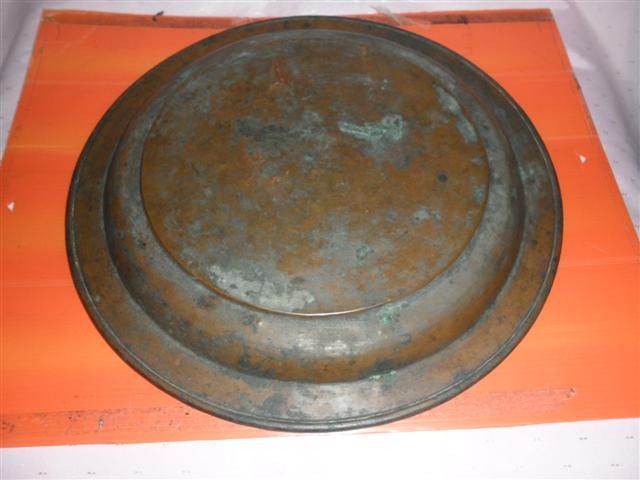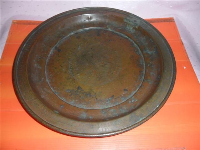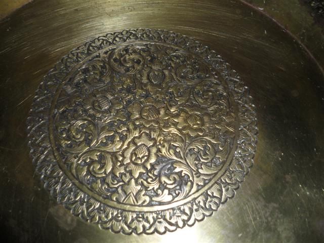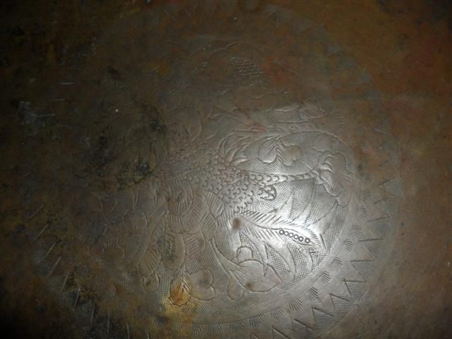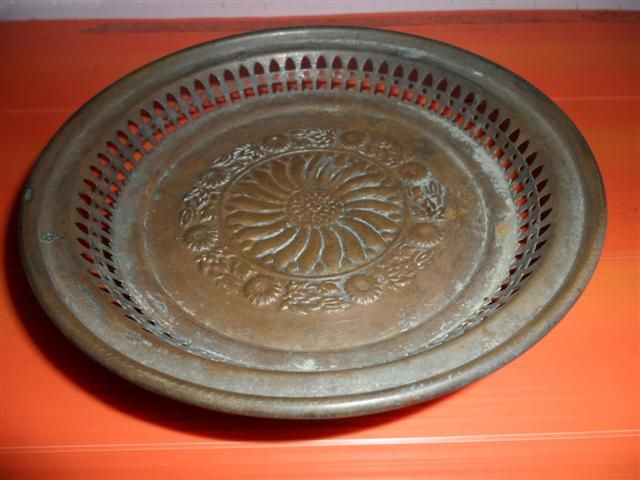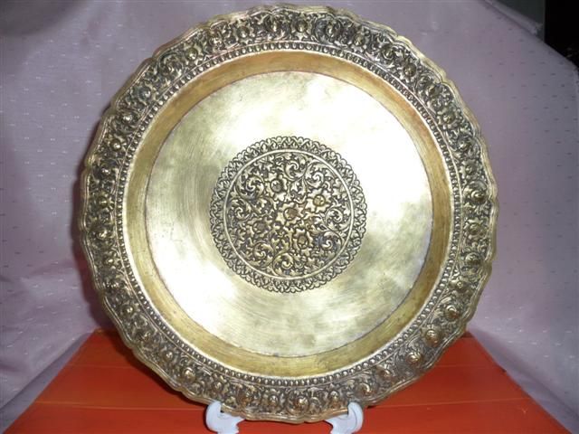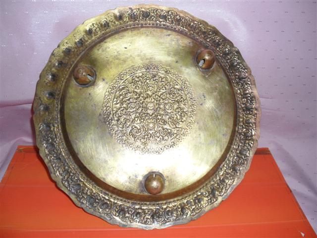 19.ถาดทองเหลืองงานเก่ามากๆ มาแบบดิบๆเลย สภาพโชกโชนพอสมควร ของเดิมมีขาสิงห์ แต่ไม่เหลือให้เห็นแล้ว ก็คงใช้ต่อๆกันมาจนตำแหน่งที่มีขาเหลื่อมเป็นมัน กลืนเป็นเนื้อเดียวกับถาด สวยไปอีกแบบ ใครชอบแนวๆนี้เก็บได้เลย..ขลัง...ไม่รั่วไม่ผุไม่แตก จะมีก็แต่ร่องรอยการใช้งาน.. ตรงกลางเป็นรูปไก่ฟ้า ขอบถาดแกะลายเล็กๆ ขนาด 12.5 นิ้ว ราคาพิเศษ 850 บาท พร้อมส่ง