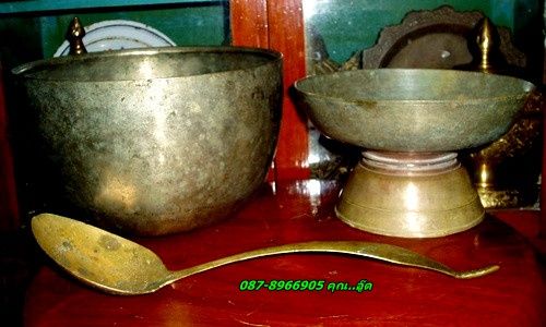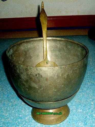 (ขายแล้ว) ชุดขันพานรองและทัพพีทองเหลืองโบราณ งานเก่ามากๆ สภาพสวยสมบูรณ์ไม่มีตำหนิหรือชำรุดใบใหญ่อลังการมาก ขนาดขันสูง 5+นิ้ว ศก.9นิ้ว นน.ขัน800g พานรองสูง 4+นิ้ว ศก.7.5นิ้ว นน.พาน500g ขาย SALE บาท รวมส่ง โทร:087-896-6905