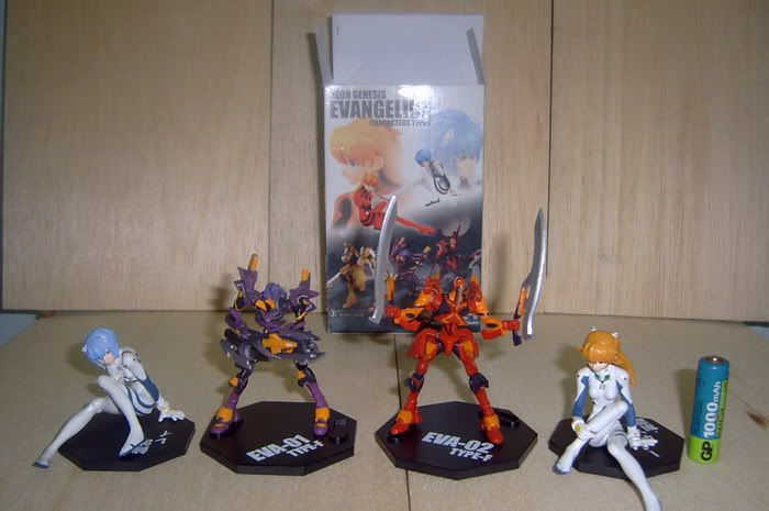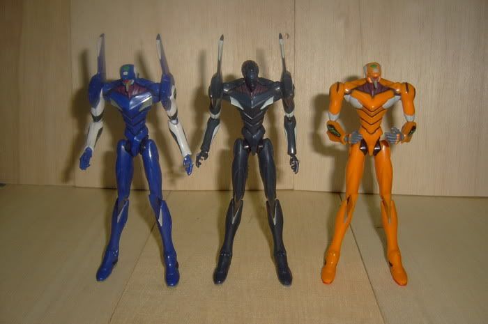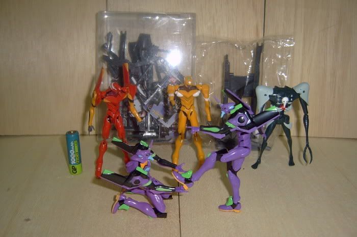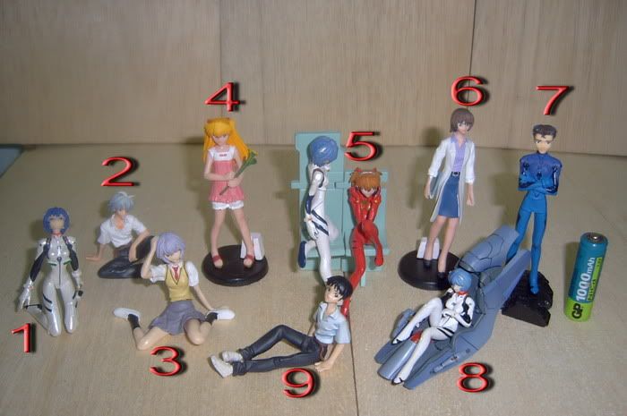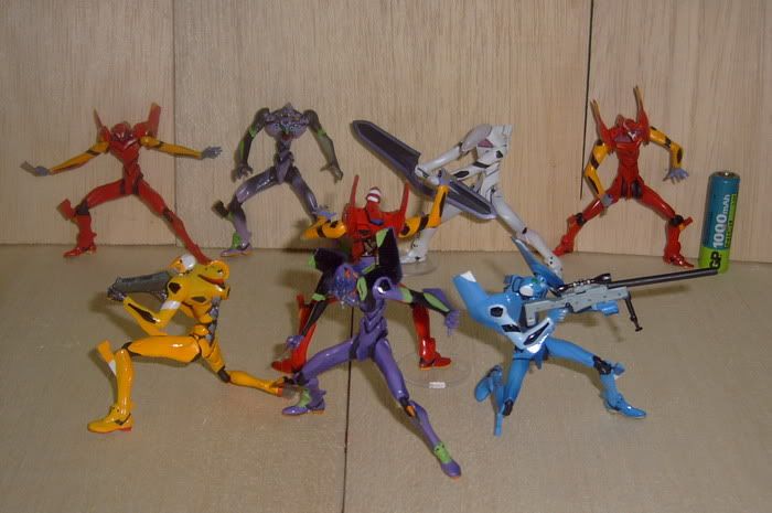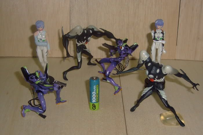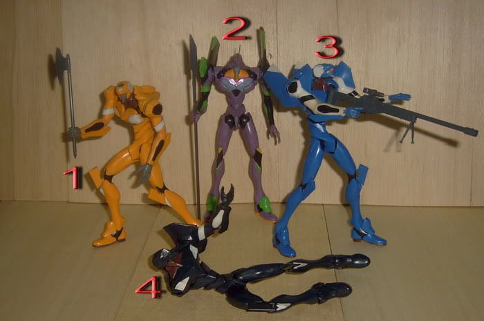 eva-00 01 HG 8 นิ้วอุปกรณ์มีเท่าที่เห็น ตัวละ 200 บาท เหมาหมดแถมตัวสีดำ 03 แขนขาดเอาไปโมเล่น คุณโอจอง