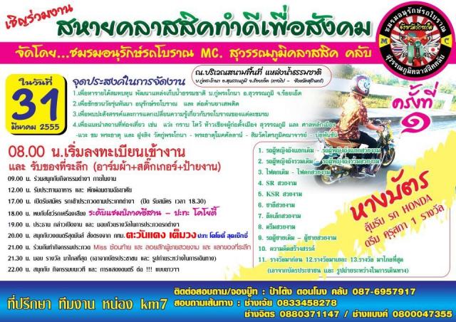 ข้อความดั้งเดิมโดยคุณ BanK_SR400 แป่วงานชนกัน...? แนบเอกสาร 3250302 เชิญรวมงาน สหายคลาสสิคทำดีเพื่อสังคม ครั้งที่ 1 ในวันที่ 31 มีนาคม 2555 จัดโดย...ชมรมอนุรักษ์รถโบราณ mc. สุวรรณภูมิคลาสสิค คลับ จ.ร้อยเอ็ด ณ.บริเวณสนามพื้นที่ แหล่งเก็บน้ำธรรมชาติ บ.กูพระโกนา อ.สุวรรณภูมิ จ.ร้อยเอ็ด (ทางไป – จังหวัดสุรินทร์) http://www.thaiscooter.com/forums/sh...d.php?t=643222 คนละฝังคับไม่เป็นไร