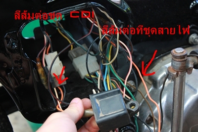 2.สายสีส้มมันออกมาจากcdi แต่ไม่มีสายในชุดสายไฟครับ มันจะเหลือสีเขียวแดงอยู่1สายครับจากชุดสายไฟ มีสองเส้นเส้นหนึ่งไปหน้ารถแล้วอีกเส้นสั้นๆลอยไว้อย ู่แถวปลั๊กต่อชุดสายไฟ