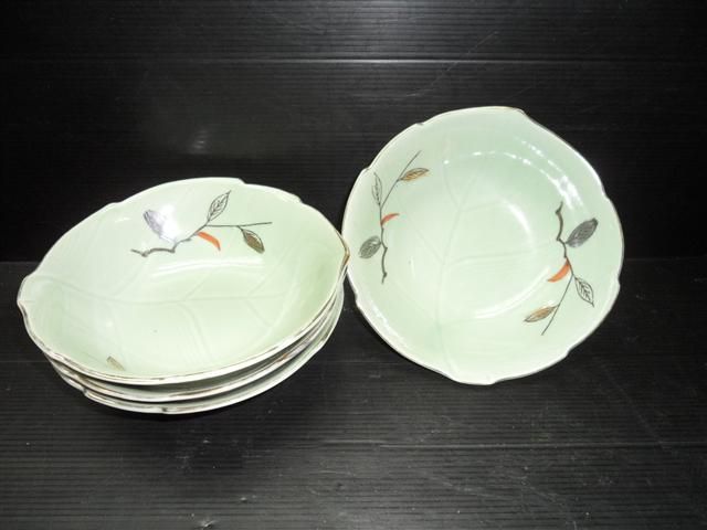 725. (10) ชามสีเขียวลายใบไม้ ขอบทอง งาน JAPAN กว้าง 6 นิ้ว มี 4 ใบ ขาย 320 บาท ส่ง 50 บาท