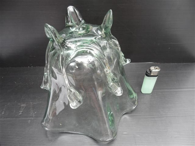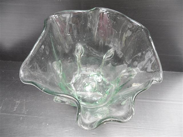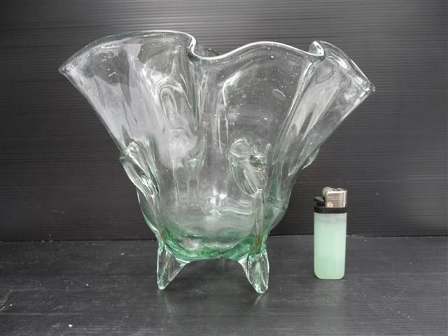 726. (7) แจกันแก้วหล่อปากจีบสบัดงานเก่า สีเขียวอ่อน หนาหนัก กว้าง 7.5 นิ้ว สูง 7 นิ้ว สมบูรณ์ ขาย 580 บาท