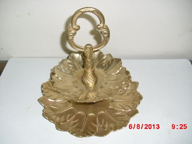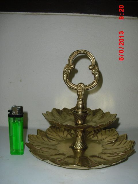 1389-ชั้นวางขนมทองเหลือง ชั้นบนกว้าง 5 นิ้ว ชั้นล่าง 7.5 นิ้ว หนาและหนักหนึ่งกิโลกรัม สูง 7 นิ้ว ขาย 850 ค่าส่ง 50 ขายคุณชยันตร์ธรค่ะ