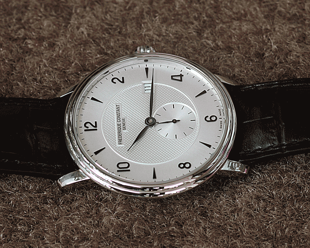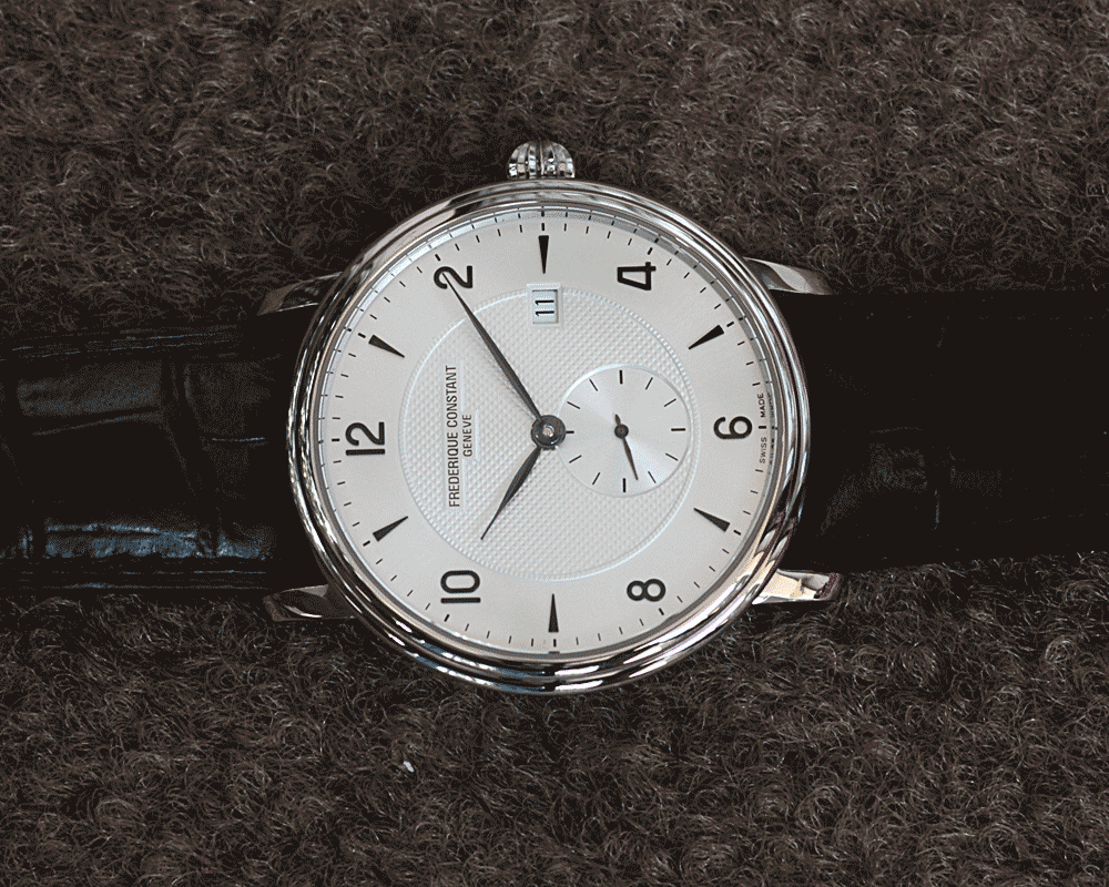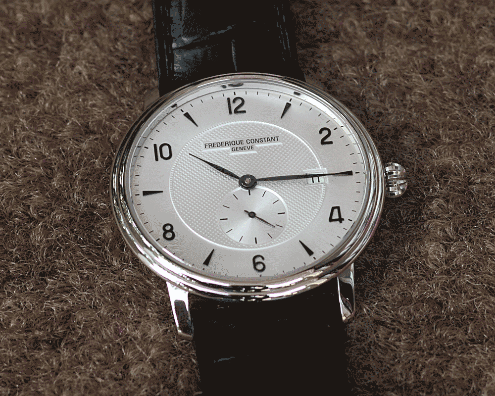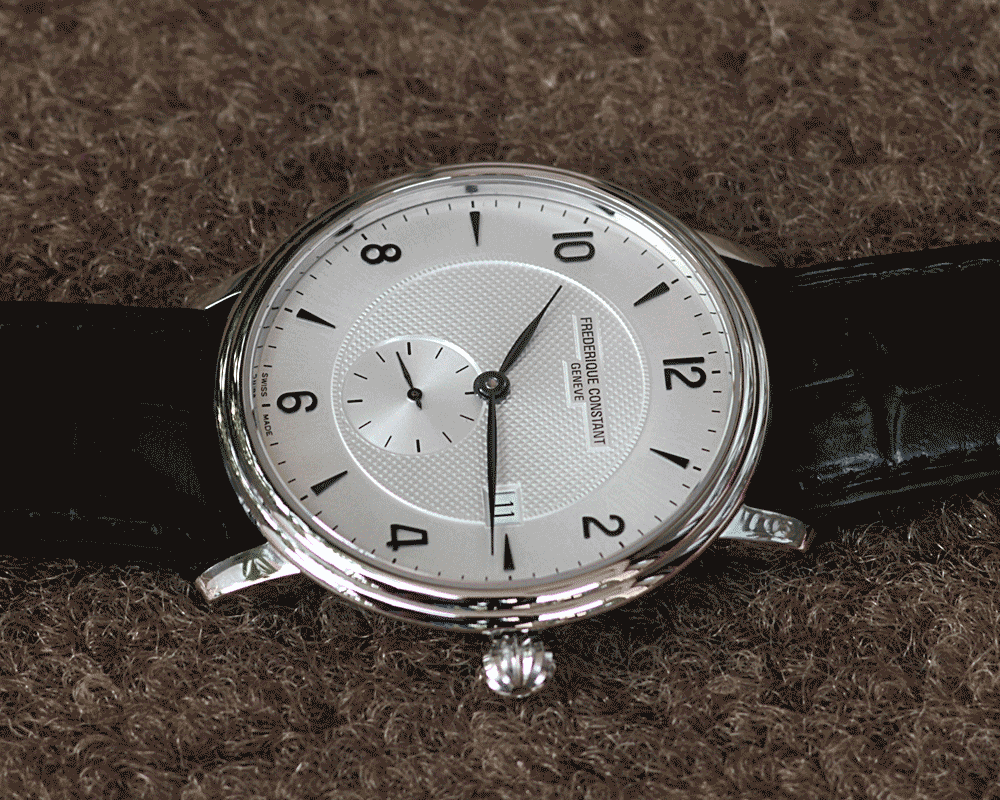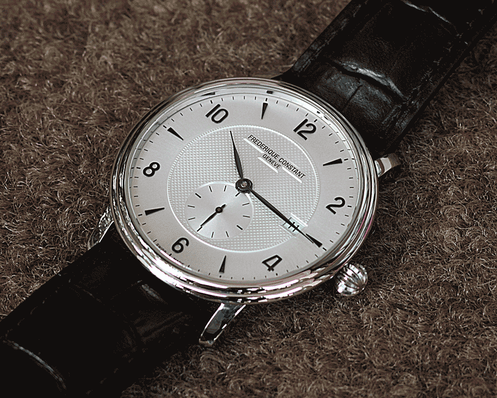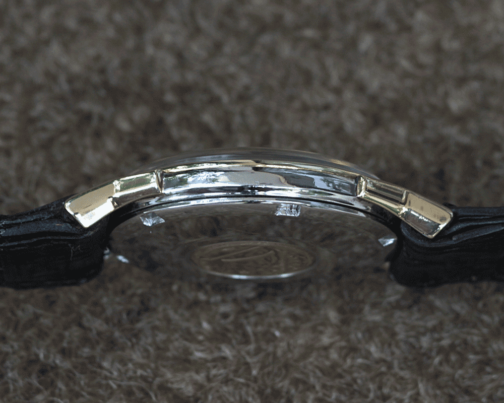 หน้าปัทม์สีเงิน หลักขีดสลับเลขอารบิคสองเข็มครึ่ง