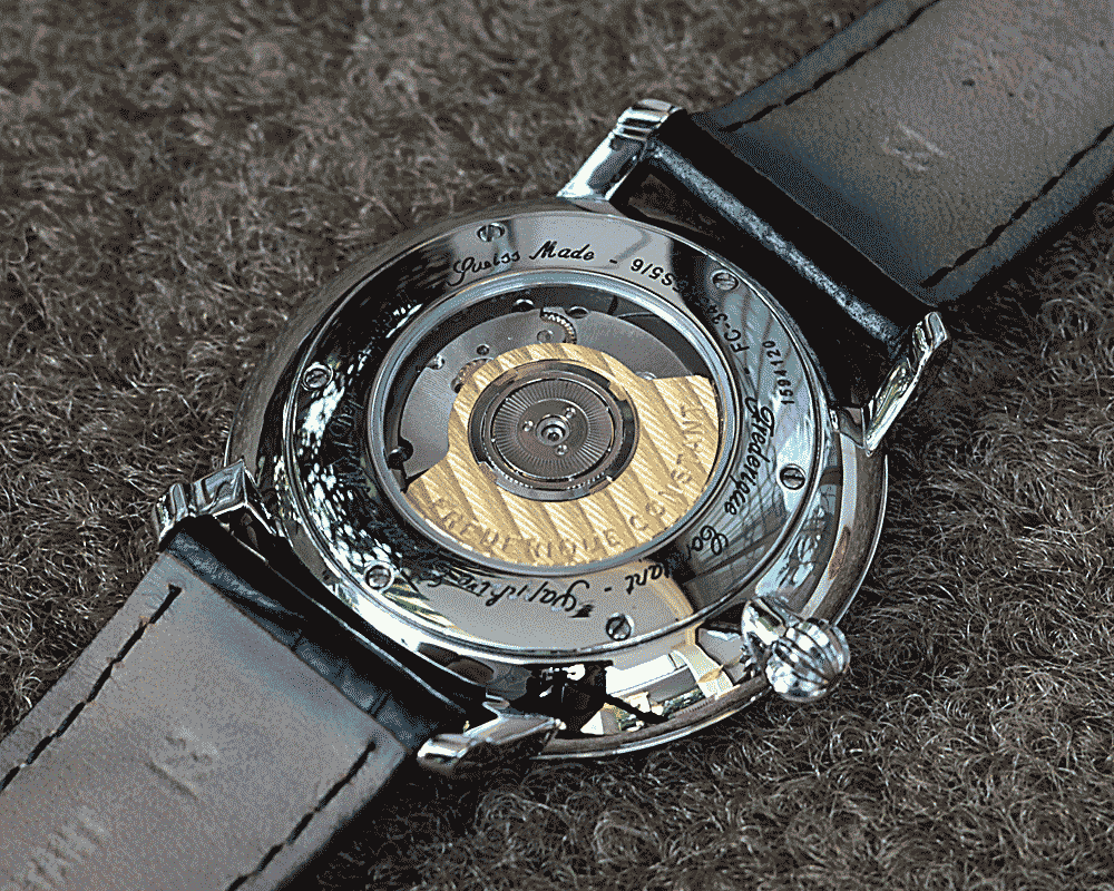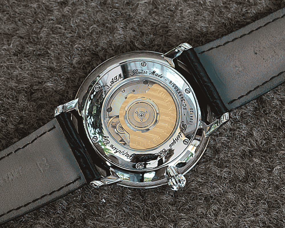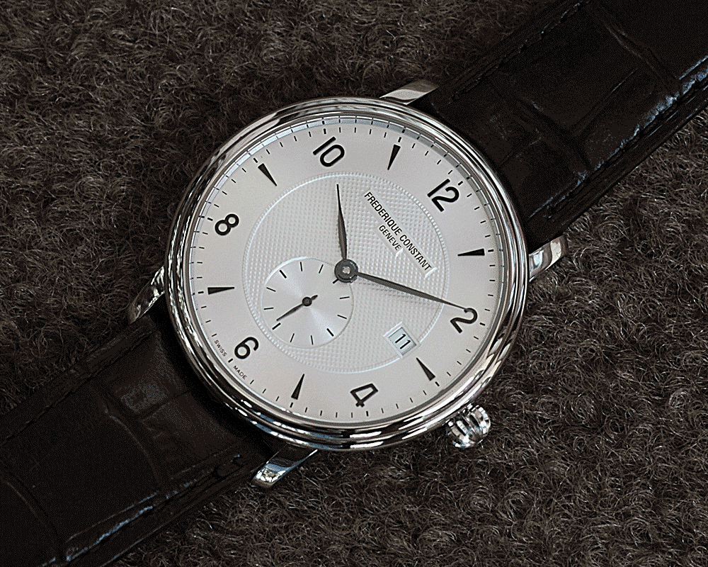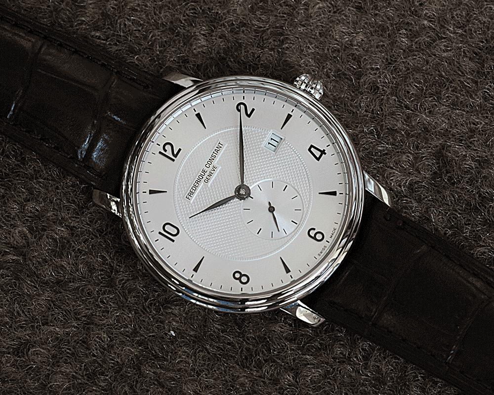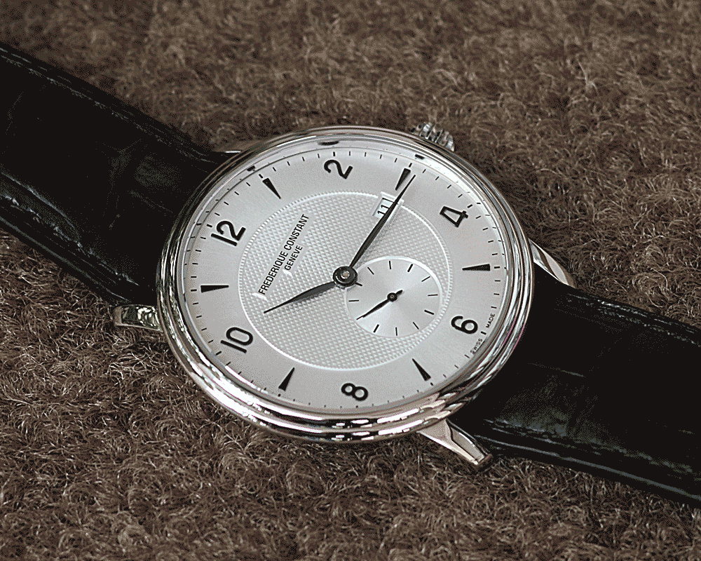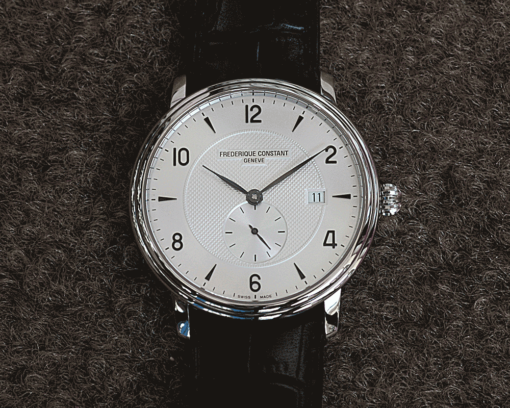 หน้าปัทม์สีเงิน หลักขีดสลับเลขอารบิคสองเข็มครึ่ง