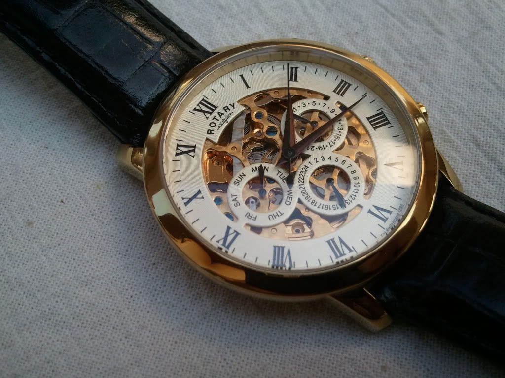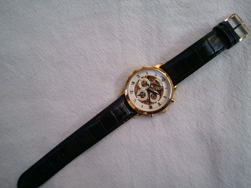 ตัวเรือนสแตนเลสทองทรงสวย หน้าปัดคลีมเปลือยโชว์กลไล