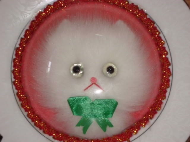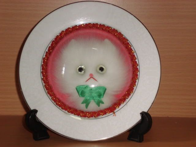 จานโชว์รูปแมวงานเก่าจีน ตัวตุ๊กตาแมวอยู่ในจานมีกระจกแก้วครอบนูนอีกชั้นนึงห นาๆ ที่ขอบจานมีลายดอกไม้ใบไม้