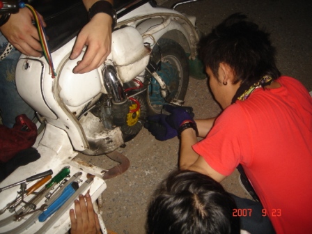 หลังจากที่ออกมาจากปั๊มเจท ได้สักร้อยเมตรก็มาถึงตารถของเจ้าเอิ๊กงอแงบ้างแล้วล ่ะ และแล้วช่างเราก็เริ่มทำงานทันที (การกลับมาของแก๊งมือดำ) แต่เราได้ลืมอะไหล่ไว้ที่บ้านเลยต้องเข็นรถกลับไปที่ ปั๊มเพื่อนั่งรออะไหล่ที่เพื่อนที่พัทยาขับรถเอามาให ้ครับ