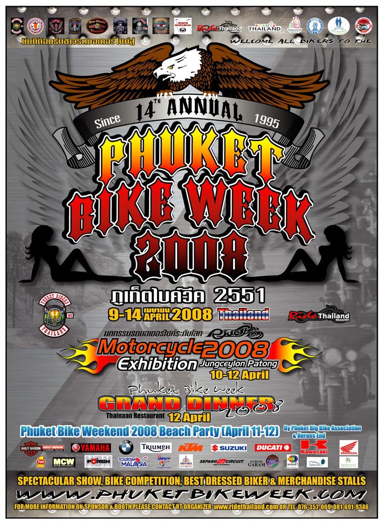 ยิ่งใหญ่ที่สุดในเอเชีย ฉลองครบรอบปีที่ 14 งานภูเก็ตไบค์วีค กับ มหกรรมการแสดงรถมอเตอร์ไซค์ระดับโลกทุกยี่ห้อ ทุกประเภท พร้อมร่วมกิจกรรมของชาวมอเตอร์ไซค์จากทั่วโลก ที่จังหวัดภูเก็ต พลาดไม่ได้ ในระหว่างวันที่ 9-14 เมษายน พ.ศ.2551