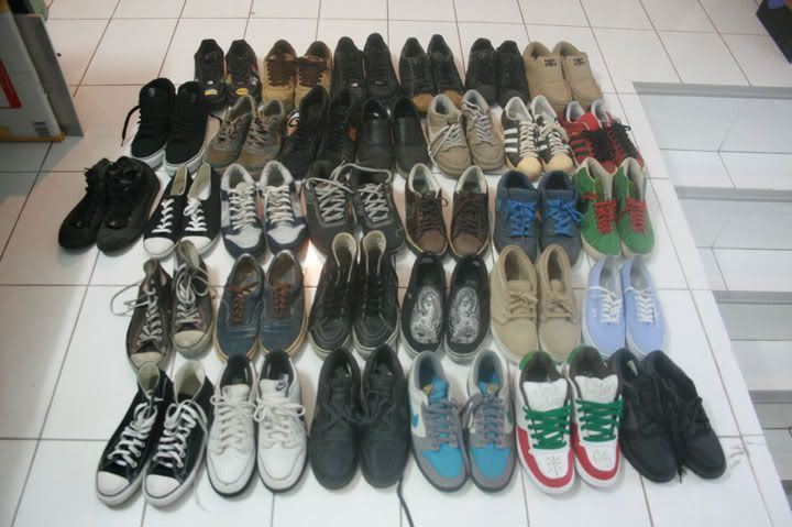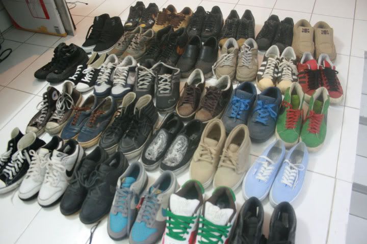 แถวที่3 : pony snoop dogg มีสองคู่, converse ซื้อจากเมกา, nike dunk baseball, nike sb zoom air สีม่วง, nike sb ด้านข้างกำมะหยี่ ใส่เตะสเก็ต ไม่ขายแล้ว, nike 6.0 สีฟ้า ไม่ขายแล้ว, nike blaser
