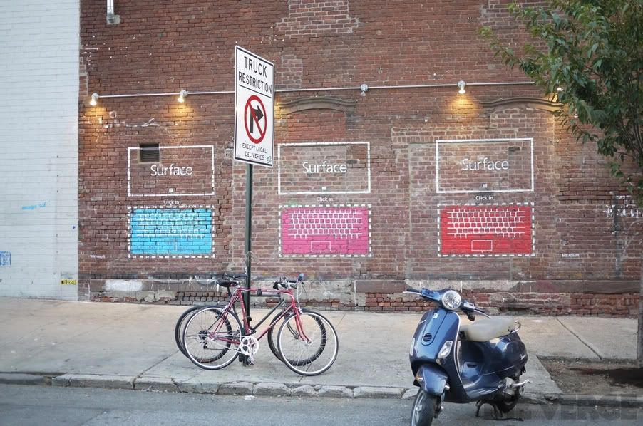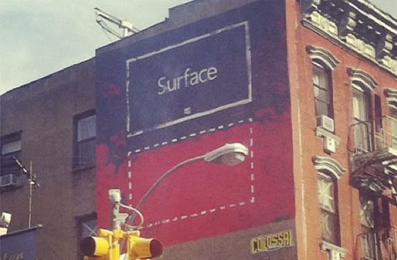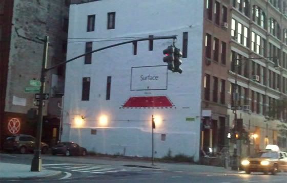 ผู้คนในกรุงนิวยอร์กรายงานว่า ได้พบกับภาพวาดแท็บเล็ต Surface บนผนังอาคารหลายจุดด้วยกัน โดยภาพวาดดังกล่าว (ดูได้ที่ท้ายข่าว) เหมือนกับภาพลายเส้นที่ไมโครซอฟท์ใช้ตอนเปิดตัวแท็บเ ล็ต