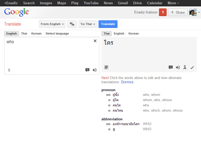 - การแสดงไวพจน์ (คำพ้องความหมาย) ผลการค้นหาจะแสดงคำอื่นๆ ที่มีความหมายใกล้เคียงกับผลการแปลอันดับแรก โดยรายการไวพจน์ต่างๆ จะแสดงอยู่ใต้กล่องข้อความที่แสดงผลการแปล ทว่าฟังก์ขันนี้ยังคงใช้งานได้กับการแปลจากภาษาอังกฤ ษ หรือแปลไปสู่ภาษาอังกฤษเท่านั้น