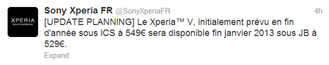 ข้อความทวีตล่าสุดจาก Sony ฝรั่งเศส ระบุว่า กำหนดการวางขายสมาร์ทโฟนรุ่น Xperia V จะถูกเลื่อนไปเป็นช่วงเดือนมกราคมปีหน้า โดยจะมาพร้อมระบบปฏิบัติการ Android รุ่น Jelly Bean