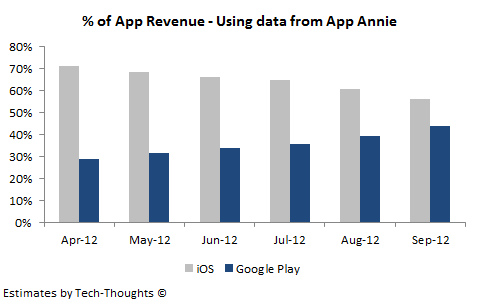 ข้อมูลหลักของเว็บ Tech-Thougths มาจากบริษัทเก็บสถิติแอพชื่อ App Annie ที่ระบุว่าสัดส่วนรายได้ระหว่าง Android:iOS ของแอพเดียวกันคือ 29:71 ในช่วงสี่เดือนแรกของปีนี้ แต่พอมาถึงเดือนกันยายน ตัวเลขเปลี่ยนไปกลายเป็น 44:66 (เป็นเลขประเมินของ Tech-Thoughts)