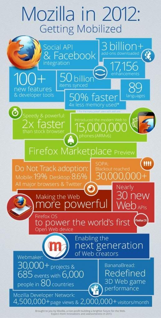 Mozilla นำเสนอผลงานการพัฒนาซอฟต์แวร์ของทีมงานผ่านทาง infographic ชูจุดเด่นและความสำเร็จที่สำคัญซึ่งผ่านมาในรอบปี 2012